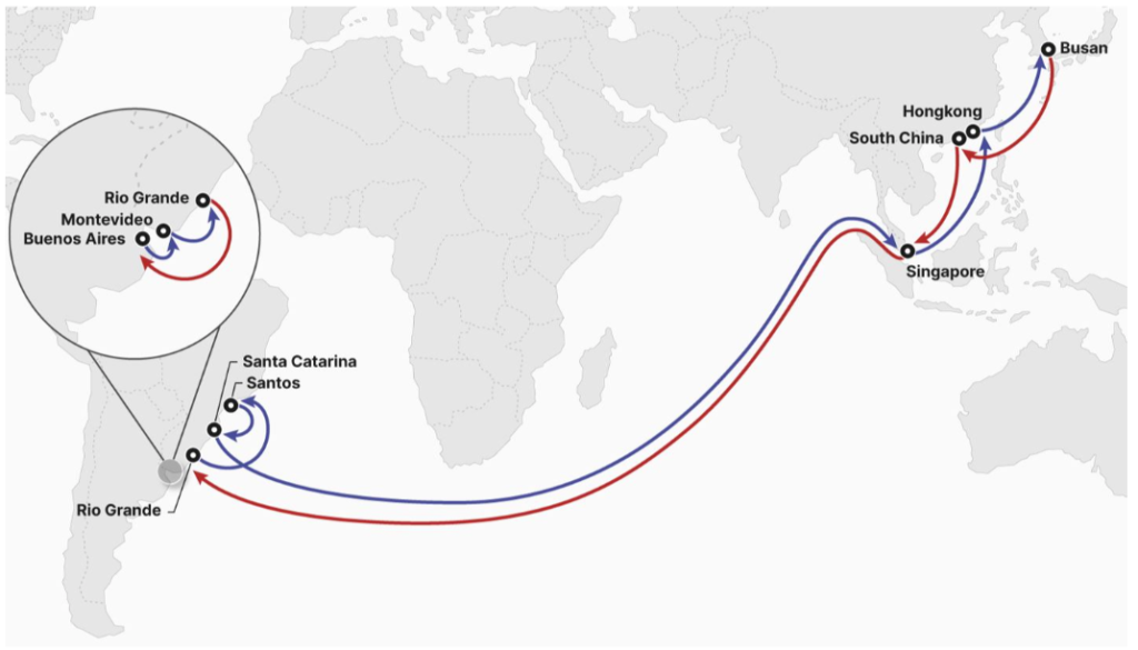 East Coast South America Express 2 (SX2) / Far East Asia-East Latin America (FL2): Pusan (South Korea) – South China – Singapore – Rio Grande (Brazil) – Santos (Brazil) – Santa Catarina (Brazil) – Singapore – Hong Kong – Pusan